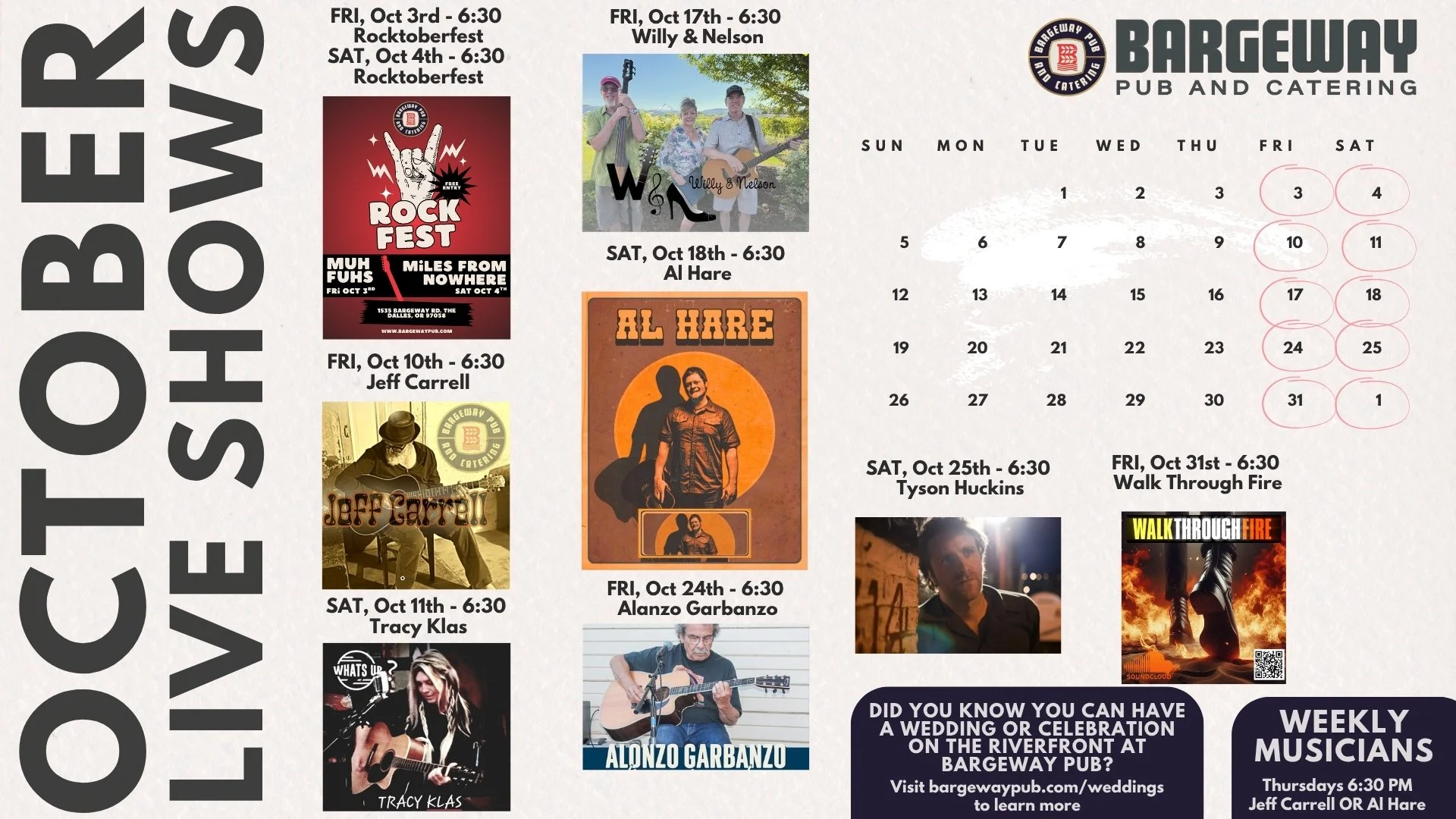 We host live music multiple nights a week. Outside in the summer and inside in the winter. Come listen to touring artists and local favorites with great food and drink from the comfort of your favorite spot in The Dalles, The Bargeway.